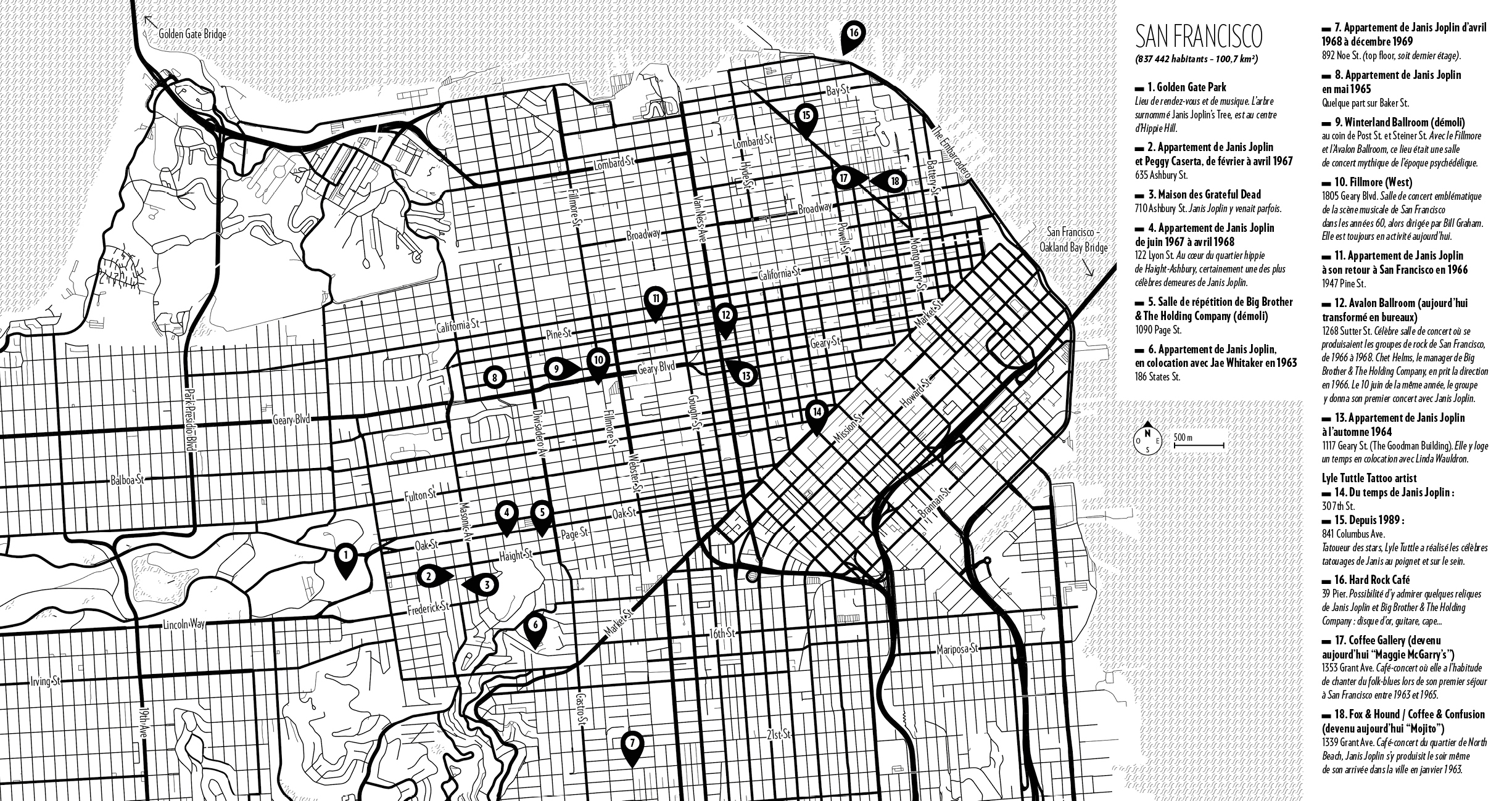 Dépliant comprenant les cartes de San Francisco, Los Angeles et Marin County avec les points d’intérêts liés à la vie de Janis Joplin.